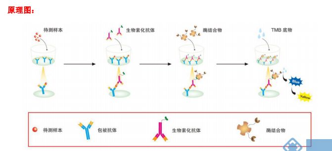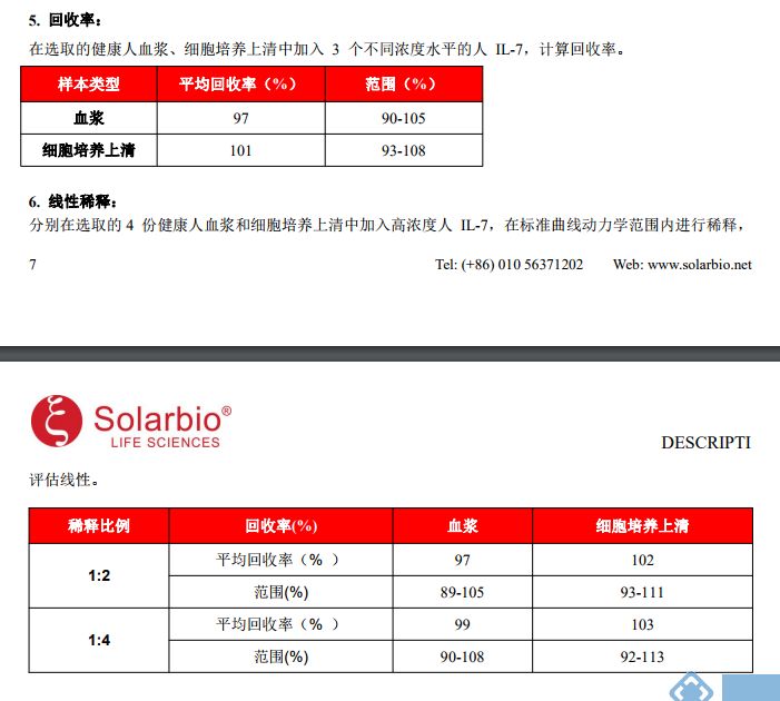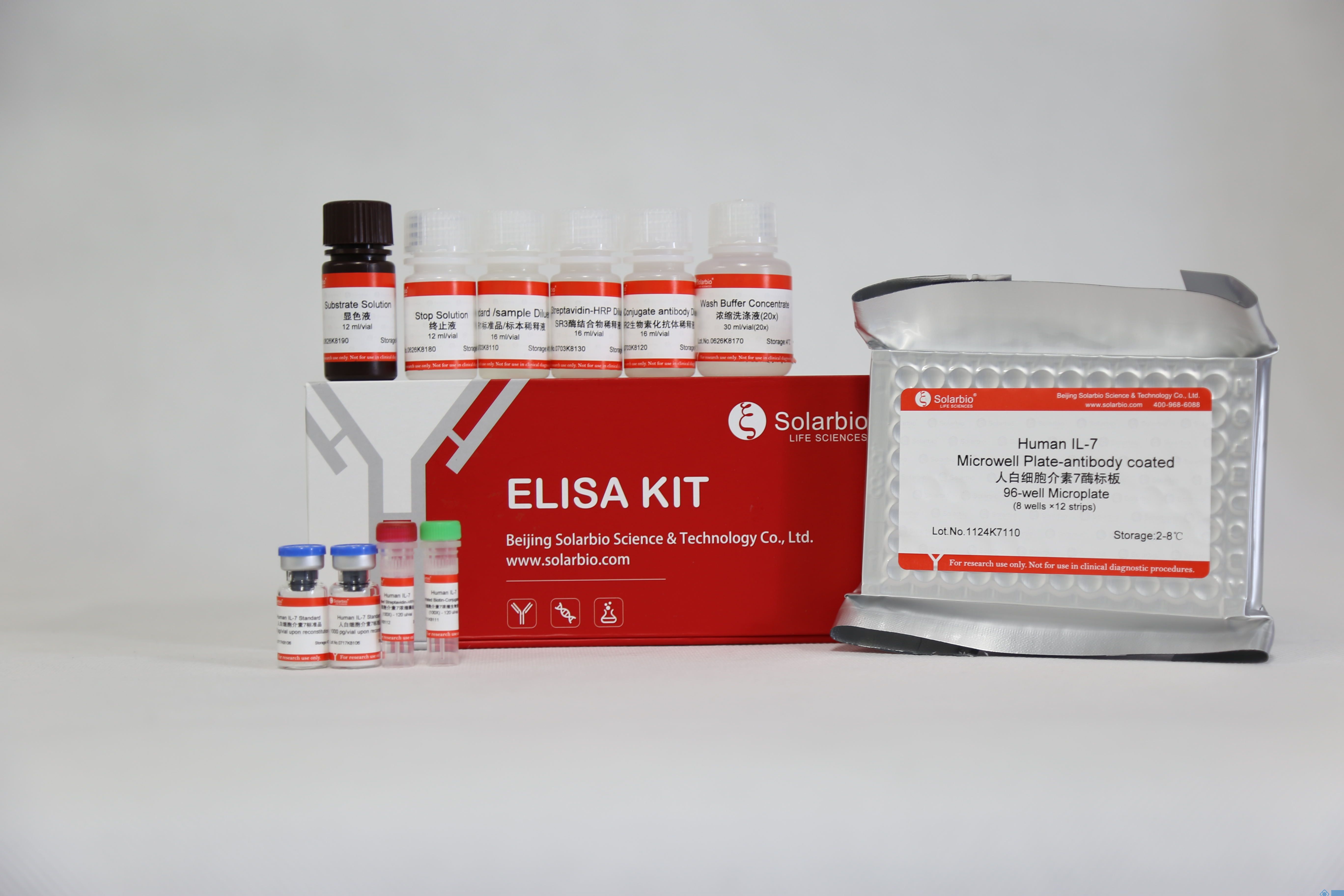Solarbio (Solarbio ®) ELISA 试剂盒采用基于双抗体夹心法的酶联免疫吸附检测技术。将抗人 IL-7 单克隆抗体包被在酶标板上;分别加入梯度稀释的标准品和预稀释的样本,标准品和样本中的人 IL-7 会与酶标板上的包被抗体充分结合;洗板后加入生物素化抗人 IL-7 抗体,该抗体会与板子上包被抗体捕获的标准品和样本中的人 IL-7 发生特异性结合;洗板后加入辣根过氧化物酶(HRP)标记的链霉亲和素,生物素与链霉亲和素会发生高强度的非共价结合;洗板后加入显色剂底物 TMB,若反应孔中样品存在不同浓度的人 IL-7,则 HRP 会使无色 TMB 变成不同深浅(正相关)的蓝色物质,加入终止液后反应孔会变成黄色;最后,在λmax=450 nm(OD=450 nm)处测定反应孔样品吸光度(OD),样本中的人 IL-7 浓度与 OD 成正比,通过绘制标准曲线和四参数拟合软件便可计算出样本中人 IL-7 的浓度。