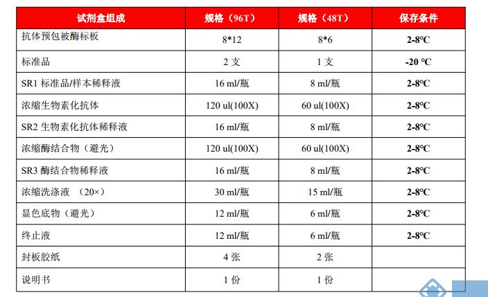 试剂盒中的终止液为酸性溶液,操作人员在使用时请带上手套并注意防护;在操作过程中也要避免试剂接触皮肤和眼睛,如果不慎接触,请用大量清水清洗;检测血液样本及其它体液样本时,请按国家生物实验室安全防护有关管理规定执行。试剂盒组成及储存: