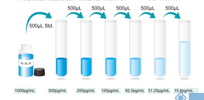 3. 标准品梯度稀释:加入标准品/样本稀释液(SR1)1ml至冻干标准品中,静置15分钟待其完全溶解后轻轻混匀(浓度为1000pg/ml),然后在其余七管中各加入500L标准品/样本稀释液(SR1),按照以下浓度进行2倍稀释:1000、500、250、125、62.5、31.2、15.625、0 pg/ml进行稀释。1000pg/ml标准曲线最高点浓度,标准品/样本稀释液(SR1)作为标准曲线的零点(0pg/ml)。复溶过的标准品原液(1000pg/ml)未用完的应废弃或根据需要按照一次用量分装,并将其贮存在-20~-80℃冰箱,具体如下图。
