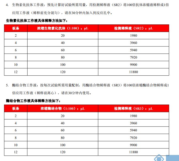 5. 为避免交叉污染,请在试验中使用 1 次性试管,枪头,封板膜(※)及洁净塑料容器。. 6. 浓缩生物素化抗体和浓缩酶结合物的体积较少,在运输过程中微量液体会沾到管壁及瓶盖上,使用前请离心处理(5-10 S 即可),使管壁上的液体集中在管底部,取用时,请用移液器小心吹打几次。