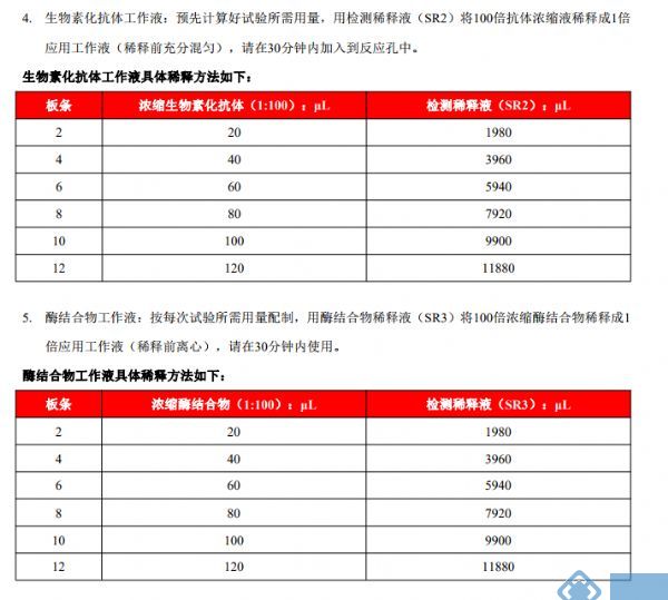血清血浆样本避免使用溶血、高血脂样本,以免影响检测结果;如果样本中的靶标物检测浓度高于标准品的最高值,请将样品做适当倍数稀释后检测,建议正式实验前做预实验以确定稀释倍数。 试剂准备: